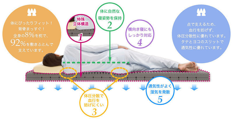 「カーボン整圧敷きふとん」は独特の立体構造で体にムリのこない楽な寝心地を実現します。